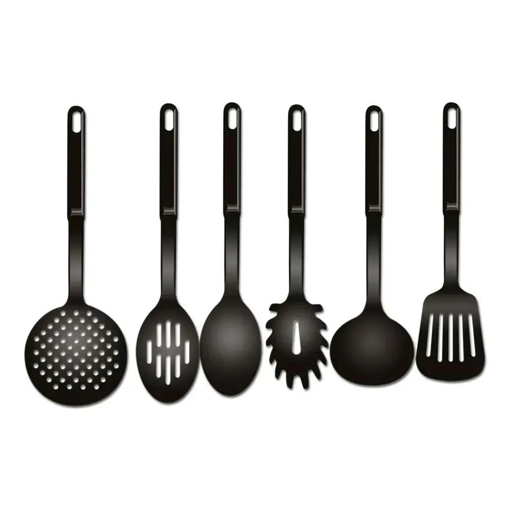 Conjunto Kit Utensílios Cozinha Nylon Colher Concha Escumadeira Espátula Pegadores Preto